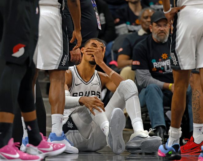 在系列赛G2中的第二节比赛,文班亚马篮下对抗遭遇霍勒迪“撤凳子”防守,结果文班亚马身体失衡,面部着地重摔,导致脑震荡提前退赛。赛后,文班亚马确诊为脑震荡,从而正式触发NBA的脑震荡保护协议,所幸他没有颅骨和颈椎附加损伤。